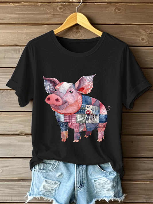 Women's Patchwork Art Pig Print Casual T-shirt
