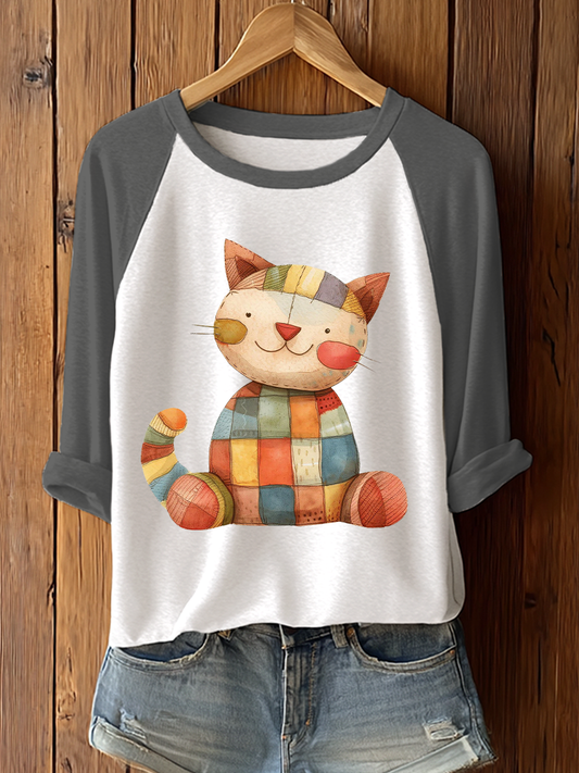 Women's Patchwork Cat Print Casual T-Shirt