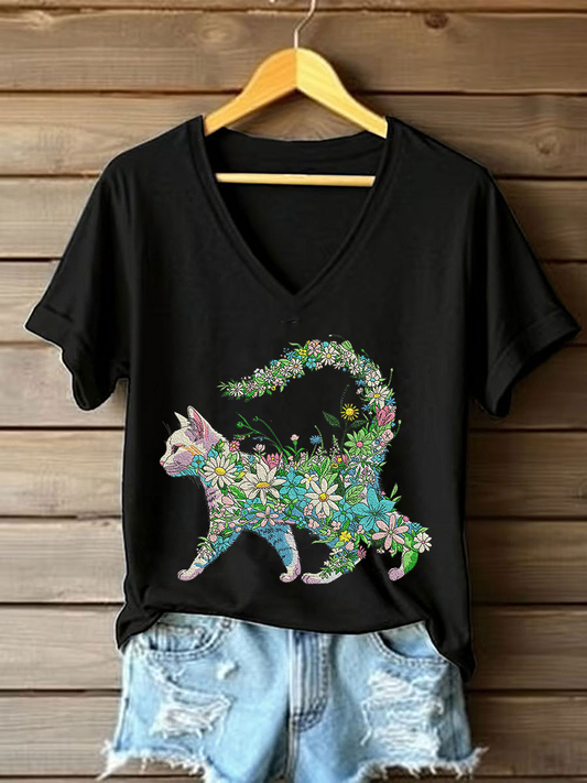 Women's Oil Painting Cute Flowers Cat Short-sleeve T-shirt