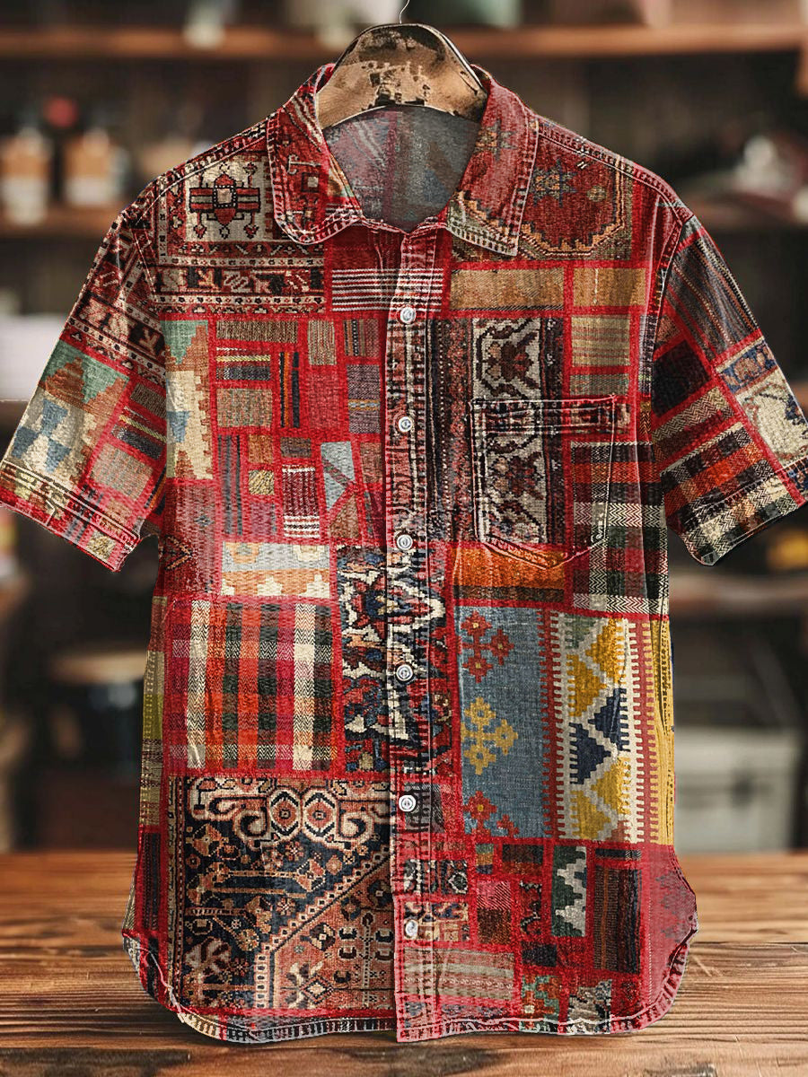Men's Retro Western Aztec Patchwork Print Cotton Shirt